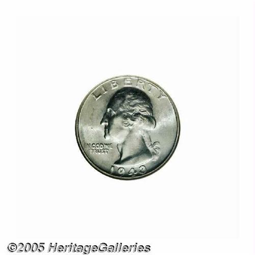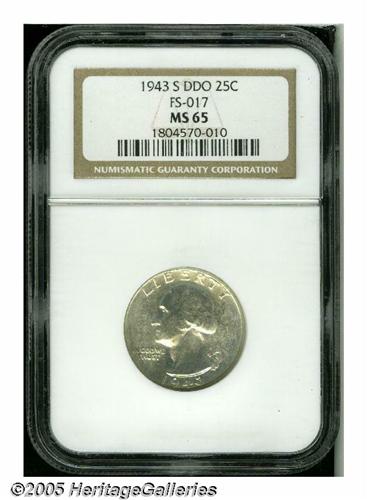 <B>1943-S<25C> Doubled Die Obverse MS65 NGC.</B></I> FS-017. Strongly doubled on the motto and the date, this is a very scarce coin to locate in mint condition. This is a bright and satiny example that shows just the slightest bit of toning on each side.