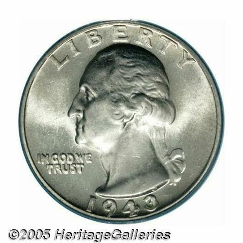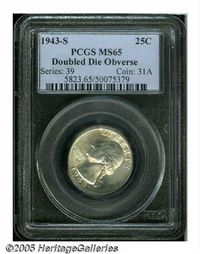 <B>1943-S<25C> Doubled Die Obverse MS65 PCGS.</B></I> Breen-4319. A rare variety showing clear doubling on IN GOD WE TRUST, LIBERTY, and the date. This highly elusive Gem is snow-white and exceptionally well struck. Population: 11 in 65, 4 finer (3/05).