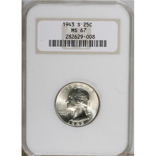 <B>1943-S 25C MS67 NGC.</B></I> NGC Census: (146/1). PCGS Population (34/1). Mintage: 21,700,000. Numismedia Wsl. Price for NGC/PCGS coin in MS67: $350. (#5822)<BR><BR><b>Shipping:</b> Coins & Currency (<a target="_blank" href="http://www.heritageauctions.com/common/shipping.php">view shipping information</a>)