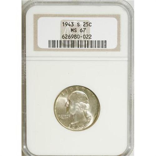 <B>1943-S 25C MS67 NGC.</B></I> . NGC Census: (148/1). PCGS Population (34/1). Mintage: 21,700,000. Numismedia Wsl. Price for NGC/PCGS coin in MS67: $400. (#5822)<BR><BR><B>Coin Engraver:</B> John Flanagan<BR><BR><b>Shipping:</b> Coins & Currency (<a target="_blank" href="http://www.heritageauctions.com/common/shipping.php">view shipping information</a>)