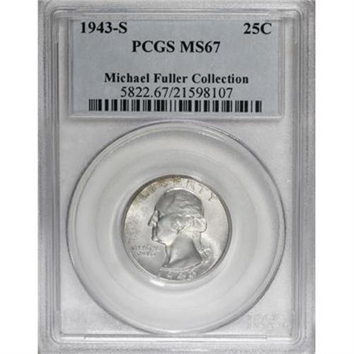 <B>1943-S 25C MS67 PCGS.</B></I> Small S mintmark, said to be rare by Fivaz. The variegated sea-green and magenta toning is particularly attractive on the reverse. Sharply struck, lustrous, and close to pristine. Population: 34 in 67, 1 finer (1/07).<BR><I>From The Michael Fuller Collection.</B></I><BR><BR><B>Coin Engraver:</B> John Flanagan<BR><BR><b>Shipping:</b> Coins & Currency (<a target="_blank" href="http://www.heritageauctions.com/common/shipping.php">view shipping information</a>)