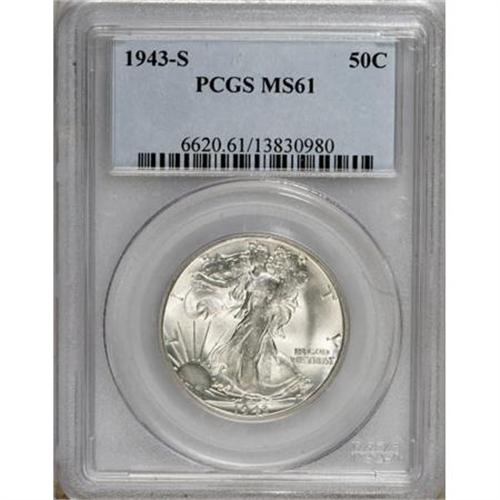 <B>1943-S 50C MS61 PCGS.</B></I> PCGS Population (7/6659). NGC Census: (13/3996). Mintage: 13,450,000. Numismedia Wsl. Price for NGC/PCGS coin in MS61: $43. (#6620)<BR><BR><B>Coin Engraver:</B> Adolph A. Weinman<BR><BR><b>Shipping:</b> Coins & Currency (<a target="_blank" href="http://www.heritageauctions.com/common/shipping.php">view shipping information</a>)