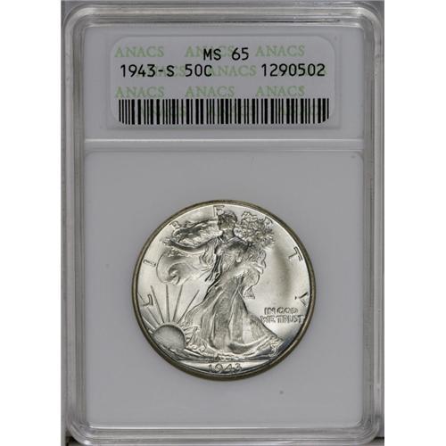 <B>1943-S<50C> MS65 ANACS.</B></I> Pleasing frosty luster combines with adequately struck devices and nicely preserved surfaces. A couple of marks on Liberty's left breast and midsection do not distract.