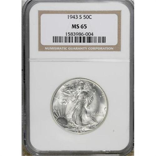 <B>1943-S 50C MS65 NGC.</B></I> . NGC Census: (1297/268). PCGS Population (2091/468). Mintage: 13,450,000. Numismedia Wsl. Price for NGC/PCGS coin in MS65: $395. (#6620)<BR><BR><B>Coin Engraver:</B> Adolph A. Weinman<BR><BR><b>Shipping:</b> Coins & Currency (<a target="_blank" href="http://www.heritageauctions.com/common/shipping.php">view shipping information</a>)