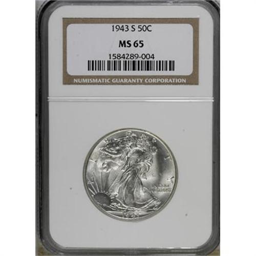 <B>1943-S 50C MS65 NGC.</B></I> NGC Census: (1292/269). PCGS Population (2119/471). Mintage: 13,450,000. Numismedia Wsl. Price for NGC/PCGS coin in MS65: $370. (#6620)<BR><BR><B>Coin Engraver:</B> Adolph A. Weinman<BR><BR><b>Shipping:</b> Coins & Currency (<a target="_blank" href="http://www.heritageauctions.com/common/shipping.php">view shipping information</a>)