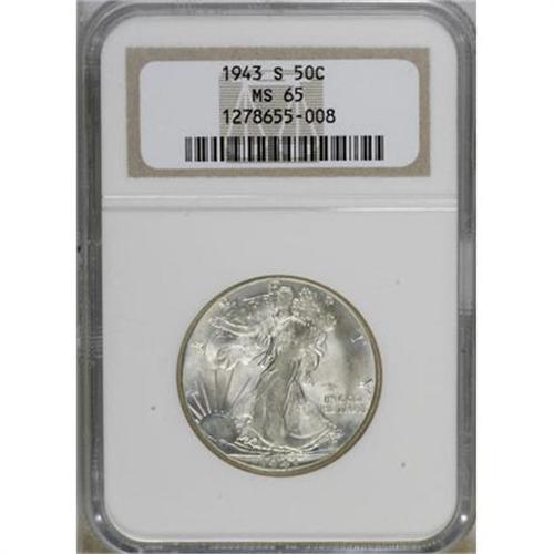 <B>1943-S 50C MS65 NGC.</B></I> NGC Census: (1292/269). PCGS Population (2118/471). Mintage: 13,450,000. Numismedia Wsl. Price for NGC/PCGS coin in MS65: $370. (#6620)<BR><BR><B>Coin Engraver:</B> Adolph A. Weinman<BR><BR><b>Shipping:</b> Coins & Currency (<a target="_blank" href="http://www.heritageauctions.com/common/shipping.php">view shipping information</a>)