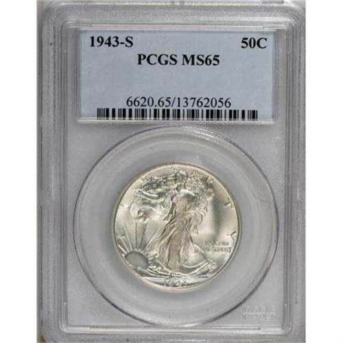 <B>1943-S 50C MS65 PCGS.</B></I> PCGS Population (2043/447). NGC Census: (1283/255). Mintage: 13,450,000. Numismedia Wsl. Price for NGC/PCGS coin in MS65: $352. (#6620)<BR><BR><B>Coin Engraver:</B> Adolph A. Weinman<BR><BR><b>Shipping:</b> Coins & Currency (<a target="_blank" href="http://www.heritageauctions.com/common/shipping.php">view shipping information</a>)