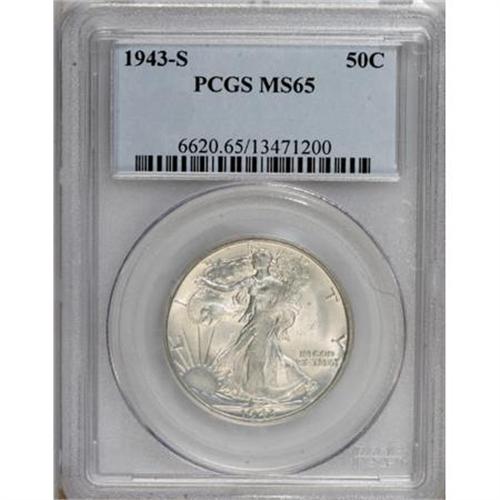 <B>1943-S 50C MS65 PCGS.</B></I> PCGS Population (2043/447). NGC Census: (1283/255). Mintage: 13,450,000. Numismedia Wsl. Price for NGC/PCGS coin in MS65: $352. (#6620)<BR><BR><B>Coin Engraver:</B> Adolph A. Weinman<BR><BR><b>Shipping:</b> Coins & Currency (<a target="_blank" href="http://www.heritageauctions.com/common/shipping.php">view shipping information</a>)