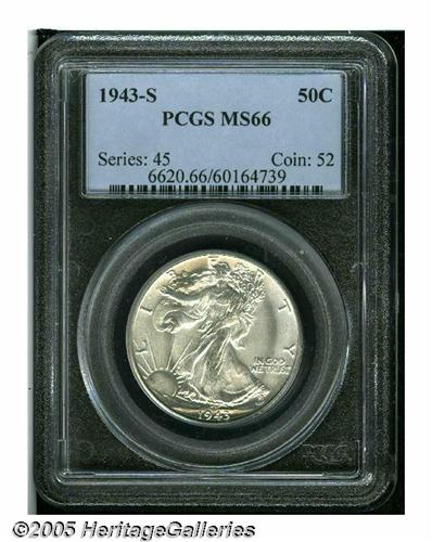 <B>1943-S<50C> MS66 PCGS.</B></I> Boldly struck, lustrous, and brilliant, with a pleasing satiny sheen on both sides, and a few scattered contact marks that are too small to really detract from the coin.