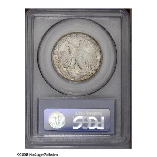 <B>1943-S<50C> MS66 PCGS.</B></I> FS-010.5. Large S. Sharply struck by the standards of the issue, the head and skirt lines are bold while the branch hand and eagle's front leg have reasonable definition. Gorgeously preserved, and the dusky sky-blue and russet toning is original. IN GOD WE TRUST exhibits strong hub doubling, not unusual for 1943-dated Walkers.