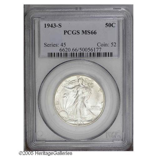 <B>1943-S<50C> MS66 PCGS.</B></I> Frosty and lustrous with brilliant white surfaces. Slightly weak at the central obverse as almost always. A wonderful example with excellent eye appeal.