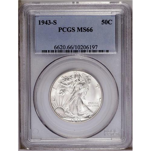 <B>1943-S<50C> MS66 PCGS.</B></I> Immaculately presented with satin luster over the unmarked and untoned surfaces. Slight central weakness is noted, but not a significant detraction from the appeal. <BR><BR><B>Important notice:</B> Heritage usually auctions material at the rate of 200-250 lots per hour. On some occasions eBay Live bid software or the Internet may not be able to keep up with the pace of the auction. We recommend placing a realistic absentee bid now as insurance to avoid disappointment. Occasionally the auctioneer may eliminate or reject an eBay Live bid, and the auctioneer may also reopen a lot after the close of the eBay live bidding (usually because we missed an audience bid), and may reject your bid even if it shows you as the winning bidder. By bidding via eBay Live, you agree that Heritage may award the lot to another bidder at its sole discretion under the circumstances described above or any other reasonable circumstances. Since eBay bids are not shown to us until we open the lot on the floor, we treat those bids just like floor bids. In most cases the floor responds before the eBay bid is presented to us, due to Internet lag time, so for consistency we have made it a policy that floor bids are always considered first over tie eBay live bids. Also please note that all Heritage lots purchased through eBay Live carry a 20% Buyer's Premium. Please make sure you read the Terms and Conditions before you bid. This lot is being auctioned in conjunction with a live floor auction by Heritage Galleries & Auctioneers. All final auction and invoice information will be supplied by Heritage Galleries & Auctioneers, and all other information should be considered preliminary. Lot:3004 <BR><BR><B>Winning Notification and Billing:</B> After the FINAL session in this auction is complete, Heritage will send e-mail and snail mail invoices. This process normally takes several days. All final auction and invoice information will be supplied by Heritage Galleries & Auctioneers, and all other information should be considered preliminary. <BR><BR>This auction will be conducted on a live auction floor and over the Internet through eBay Live. If you choose to place an absentee bid, please take a moment to <font color='#0000ff'><u><a href='http://pages.ebay.com/liveauctions/help/before/laabsentee.html'>learn how eBay Live absentee bidding works</a></u></font><font color='#000000'>