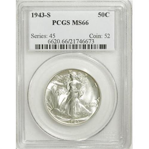 <B>1943-S 50C MS66 PCGS.</B></I> PCGS Population (423/24). NGC Census: (236/18). Mintage: 13,450,000. Numismedia Wsl. Price for NGC/PCGS coin in MS66: $550. (#6620)<BR><BR><B>Coin Engraver:</B> Adolph A. Weinman<BR><BR><b>Shipping:</b> Coins & Currency (<a target="_blank" href="http://www.heritageauctions.com/common/shipping.php">view shipping information</a>\)