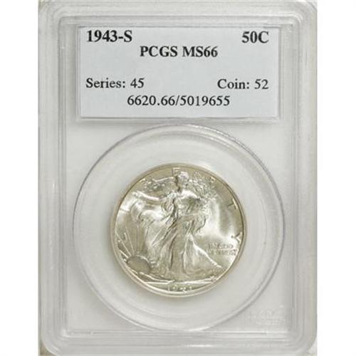 <B>1943-S 50C MS66 PCGS.</B></I> PCGS Population (421/24). NGC Census: (237/18). Mintage: 13,450,000. Numismedia Wsl. Price for NGC/PCGS coin in MS66: $550. (#6620)<BR><BR><B>Coin Engraver:</B> Adolph A. Weinman<BR><BR><b>Shipping:</b> Coins & Currency (<a target="_blank" href="http://www.heritageauctions.com/common/shipping.php">view shipping information</a>\)