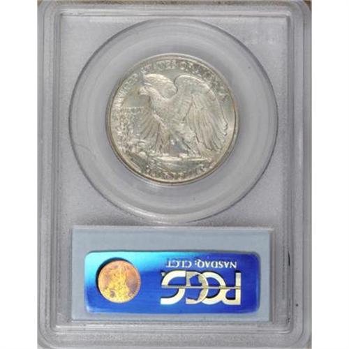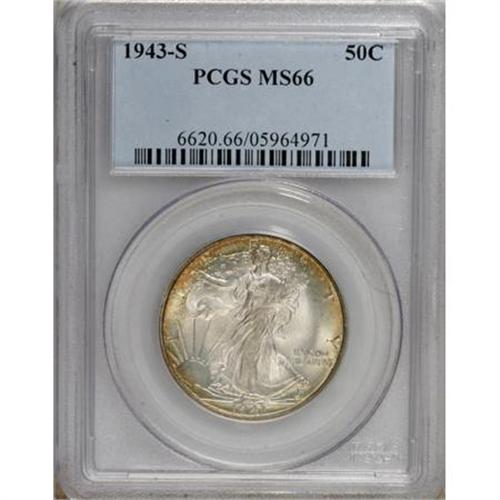 <B>1943-S 50C MS66 PCGS.</B></I> Trumpet Tail S. FS-101. IN GOD WE TRUST shows hub doubling. A lustrous and beautiful Premium Gem that has remarkably pristine surfaces. The peripheral gold toning only adds to this coin's strong visual appeal.<BR><BR><B>Coin Engraver:</B> Adolph A. Weinman<BR><BR><b>Shipping:</b> Coins & Currency (<a target="_blank" href="http://www.heritageauctions.com/common/shipping.php">view shipping information</a>)