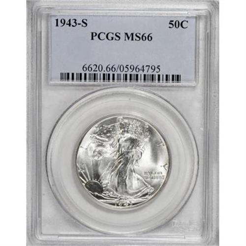 <B>1943-S 50C MS66 PCGS.</B></I> PCGS Population (423/24). NGC Census: (237/18). Mintage: 13,450,000. Numismedia Wsl. Price for NGC/PCGS coin in MS66: $550. (#6620)<BR><BR><B>Coin Engraver:</B> Adolph A. Weinman<BR><BR><b>Shipping:</b> Coins & Currency (<a target="_blank" href="http://www.heritageauctions.com/common/shipping.php">view shipping information</a>)