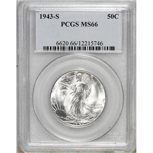 <B>1943-S 50C MS66 PCGS.</B></I> . PCGS Population (444/24). NGC Census: (248/20). Mintage: 13,450,000. Numismedia Wsl. Price for NGC/PCGS coin in MS66: $545. (#6620)<BR><BR><B>Coin Engraver:</B> Adolph A. Weinman<BR><BR><b>Shipping:</b> Coins & Currency (<a target="_blank" href="http://www.heritageauctions.com/common/shipping.php">view shipping information</a>)