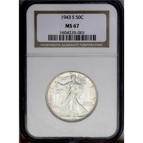 <B>1943-S<50C> MS67 NGC.</B></I> A sharply struck 1943-S half dollar with full definition on Liberty's head and a nearly complete thumb. This is a highly lustrous example with frosty, brilliant surfaces and only the faintest traces of toning. The reverse field has a semi-reflective appearance. Census: 15 in 67, 0 finer (3/06). <BR><BR><B>Important notice:</B> Heritage usually auctions material at the rate of 200-250 lots per hour. On some occasions eBay Live bid software or the Internet may not be able to keep up with the pace of the auction. We recommend placing a realistic absentee bid now as insurance to avoid disappointment. Occasionally the auctioneer may eliminate or reject an eBay Live bid, and the auctioneer may also reopen a lot after the close of the eBay live bidding (usually because we missed an audience bid), and may reject your bid even if it shows you as the winning bidder. By bidding via eBay Live, you agree that Heritage may award the lot to another bidder at its sole discretion under the circumstances described above or any other reasonable circumstances. Since eBay bids are not shown to us until we open the lot on the floor, we treat those bids just like floor bids. In most cases the floor responds before the eBay bid is presented to us, due to Internet lag time, so for consistency we have made it a policy that floor bids are always considered first over tie eBay live bids. Also please note that all Heritage lots purchased through eBay Live carry a 20% Buyer's Premium. Please make sure you read the Terms and Conditions before you bid. This lot is being auctioned in conjunction with a live floor auction by Heritage Galleries & Auctioneers. All final auction and invoice information will be supplied by Heritage Galleries & Auctioneers, and all other information should be considered preliminary. Lot:3008 <BR><BR><B>Winning Notification and Billing:</B> After the FINAL session in this auction is complete, Heritage will send e-mail and snail mail invoices. This process normally takes several days. All final auction and invoice information will be supplied by Heritage Galleries & Auctioneers, and all other information should be considered preliminary. <BR><BR>This auction will be conducted on a live auction floor and over the Internet through eBay Live. If you choose to place an absentee bid, please take a moment to <font color='#0000ff'><u><a href='http://pages.ebay.com/liveauctions/help/before/laabsentee.html'>learn how eBay Live absentee bidding works</a></u></font><font color='#000000'>