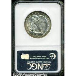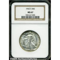 <B>1943-S 50C MS67 NGC.</B></I> An attractive coin that boasts delicate light gold toning at the periphery, with the centers bright and lustrous. Clean surfaces expected for a high end Gem, with virtually no signs of handling. For the date the strike is better than most, with a partial thumb noted on Liberty. Best of all, none are graded higher by either grading service. Population: 16 in 67, 0 finer (2/05).
