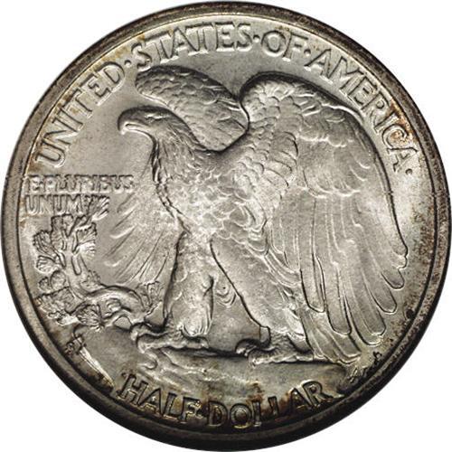 <B>1943-S<50C> MS67 <img border='0' src='http://www.heritagecoins.com/images/star.gif' width=10 height=10> NGC.</B></I> FS-010.5. Trumpet Tail S. IN GOD WE TRUST is boldly hub doubled, a feature common on many 1943 Walking Liberties. A thin iridescent crescent of copper and indigo toning graces the obverse, with a touch of color on the lower reverse. Somewhat flatly struck through the centers, but exhibiting superior satiny luster. A couple of hidden scratches are noted on the eagle. Census: 1 in 67 <img border='0' src='http://www.heritagecoins.com/images/star.gif' width=10 height=10>, 0 finer (3/06). <BR><BR><B>Important notice:</B> Heritage usually auctions material at the rate of 200-250 lots per hour. On some occasions eBay Live bid software or the Internet may not be able to keep up with the pace of the auction. We recommend placing a realistic absentee bid now as insurance to avoid disappointment. Occasionally the auctioneer may eliminate or reject an eBay Live bid, and the auctioneer may also reopen a lot after the close of the eBay live bidding (usually because we missed an audience bid), and may reject your bid even if it shows you as the winning bidder. By bidding via eBay Live, you agree that Heritage may award the lot to another bidder at its sole discretion under the circumstances described above or any other reasonable circumstances. Since eBay bids are not shown to us until we open the lot on the floor, we treat those bids just like floor bids. In most cases the floor responds before the eBay bid is presented to us, due to Internet lag time, so for consistency we have made it a policy that floor bids are always considered first over tie eBay live bids. Also please note that all Heritage lots purchased through eBay Live carry a 20% Buyer's Premium. Please make sure you read the Terms and Conditions before you bid. This lot is being auctioned in conjunction with a live floor auction by Heritage Galleries & Auctioneers. All final auction and invoice information will be supplied by Heritage Galleries & Auctioneers, and all other information should be considered preliminary. Lot:3007 <BR><BR><B>Winning Notification and Billing:</B> After the FINAL session in this auction is complete, Heritage will send e-mail and snail mail invoices. This process normally takes several days. All final auction and invoice information will be supplied by Heritage Galleries & Auctioneers, and all other information should be considered preliminary. <BR><BR>This auction will be conducted on a live auction floor and over the Internet through eBay Live. If you choose to place an absentee bid, please take a moment to <font color='#0000ff'><u><a href='http://pages.ebay.com/liveauctions/help/before/laabsentee.html'>learn how eBay Live absentee bidding works</a></u></font><font color='#000000'>
