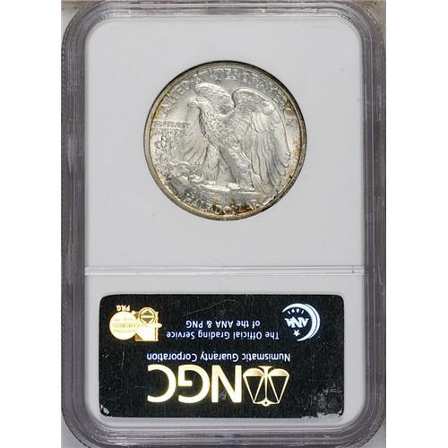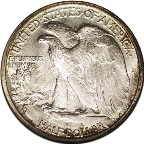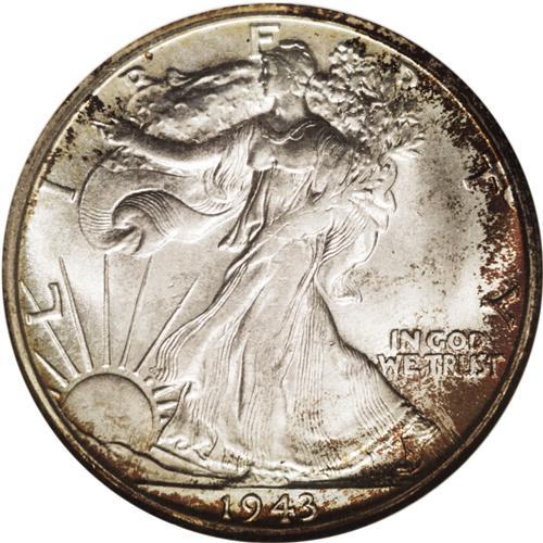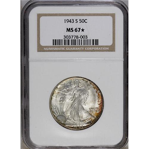 <B>1943-S<50C> MS67 <img border='0' src='http://www.heritagecoins.com/images/star.gif' width=10 height=10> NGC.</B></I> FS-010.5. Trumpet Tail S. IN GOD WE TRUST is boldly hub doubled, a feature common on many 1943 Walking Liberties. A thin iridescent crescent of copper and indigo toning graces the obverse, with a touch of color on the lower reverse. Somewhat flatly struck through the centers, but exhibiting superior satiny luster. A couple of hidden scratches are noted on the eagle. Census: 1 in 67 <img border='0' src='http://www.heritagecoins.com/images/star.gif' width=10 height=10>, 0 finer (7/06).