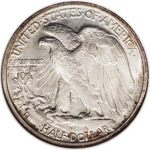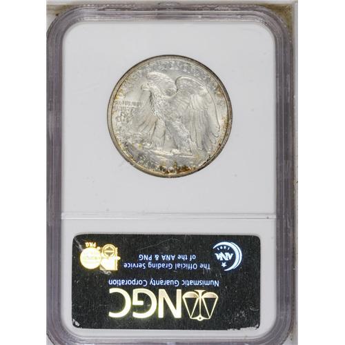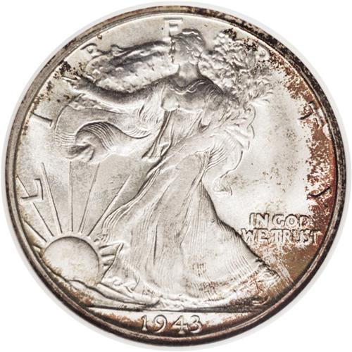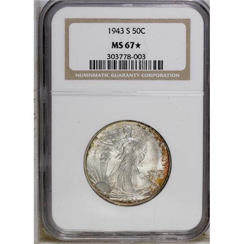 <B>1943-S<50C> MS67 <img border='0' src='http://www.heritagecoins.com/images/star.gif' width=10 height=10> NGC.</B></I> FS-010.5. Trumpet Tail S. IN GOD WE TRUST is boldly hub doubled, a feature common on many 1943 Walking Liberties. A thin iridescent crescent of copper and indigo toning graces the obverse, with a touch of color on the lower reverse. Somewhat flatly struck through the centers, but exhibiting superior satiny luster. A couple of hidden scratches are noted on the eagle. Census: 1 in 67 <img border='0' src='http://www.heritagecoins.com/images/star.gif' width=10 height=10>, 0 finer (9/06).