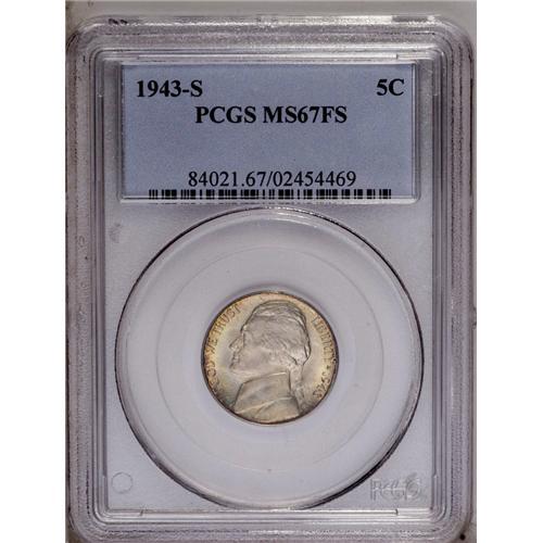 <B>1943-S<5C> MS67 Full Steps PCGS.</B></I> Beautifully toned in sea-green, rose, and gold hues. Lustrous and virtually immaculate. A vertical die crack across the portrait of Jefferson creates a mint-made 'Scarface' variety. Population: 39 in 67 Full Steps, 0 finer (3/06).