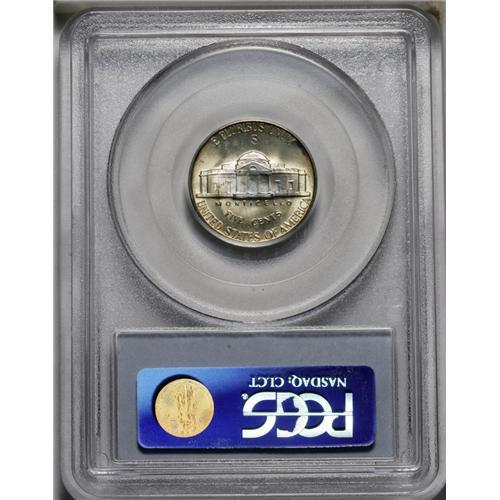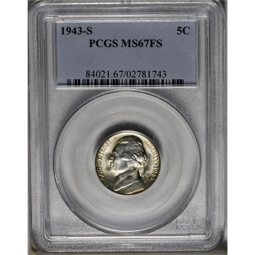 <B>1943-S<5C> MS67 Full Steps PCGS.</B></I> Fully struck with beautifully bright satiny luster, lovely ice-blue and golden-tan coloration, and the absence of any noticeable distractions on either side of the coin. A wispy die crack appears in Jefferson's upper hair detail, and another, on the reverse, extends from the lower rim beneath the O in OF to the top of Monticello's dome. A virtually immaculate Superb Gem. Population: 43 in 67, 0 finer (7/06).