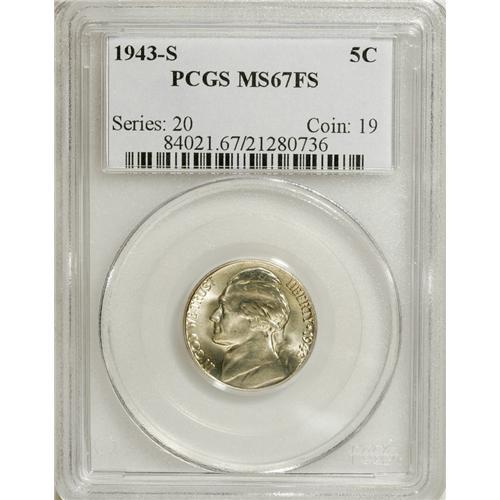 <B>1943-S 5C MS67 Full Steps PCGS.</B></I> The lavish display of teeming mint frost over each side of this Superb Gem war nickel is both unusual for the type and visually compelling. This type of luster is simply rare for a Jefferson nickel. Well struck and near-pristine, this piece is essentially untoned except for a faint greenish-gold cast. The large letters on the reverse are strikingly obvious; especially the huge "S" mintmark in the upper reverse field. Population: 45 in 67 Full Steps, 0 finer (3/07).<BR><BR><b>Shipping:</b> Coins & Currency (<a target="_blank" href="http://www.heritageauctions.com/common/shipping.php">view shipping information</a>)