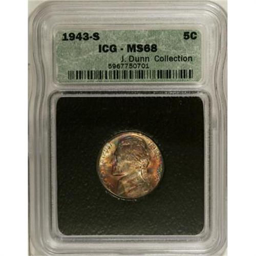 <B>1943-S 5C MS68 ICG.</B></I> Ex: J. Dunn Collection. NGC Census: (3/0). PCGS Population (0/0). Mintage: 104,060,000. (#4021)<BR><BR><b>Shipping:</b> Coins & Currency (<a target="_blank" href="http://www.heritageauctions.com/common/shipping.php">view shipping information</a>)