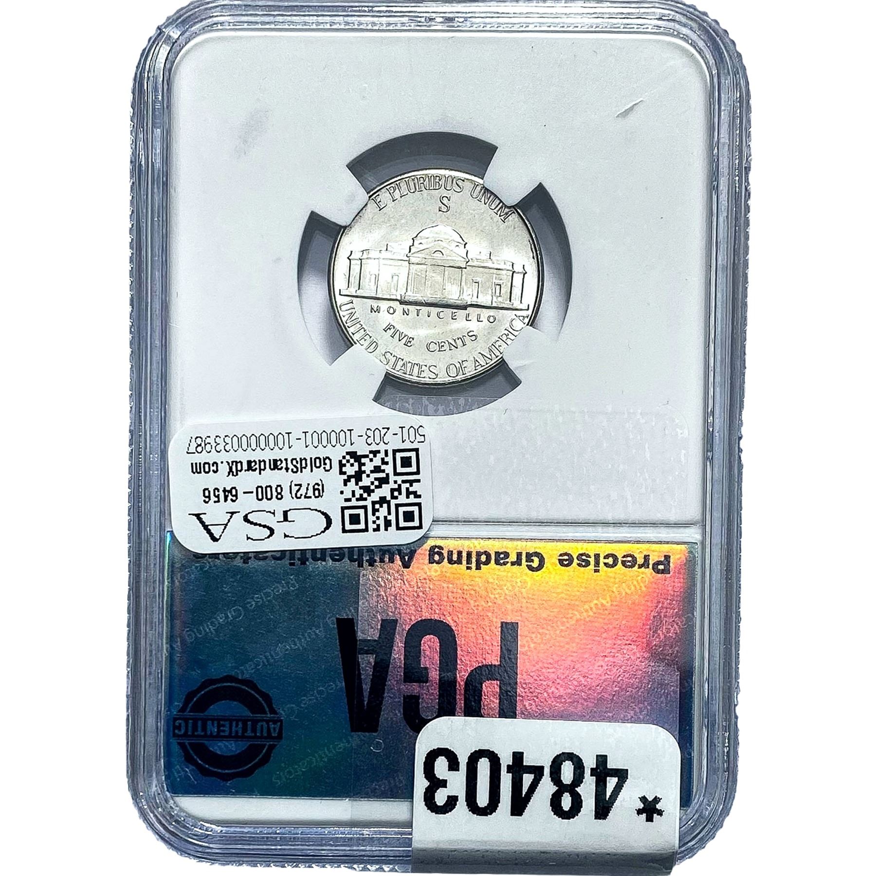 e. Coins sold referencing a third-party grading service are sold “AS IS” without any express or implied warranty, except for a guarantee by GSA that they are genuine. Removal or alteration of the holder, voids all of Bidder’s claims concerning that Product. Certain warranties may be available from the grading services and Bidders are referred to them for further details: Numismatic Guaranty Corporation (NGC), PO Box 4776, Sarasota, FL 34230, www.ngccoin.com/services/writtenguarantee.asp; Professional Coin Grading Services (PCGS), PO Box 9458, Newport Beach, CA 92658, www.pcgs.com/guarantee.html; ANACS, 6555 S. Kenton St., Ste. 303, Englewood, CO 80111; and Independent Coin Grading Co. (ICG), 7901 East Bellview, Ave., Suite 50, Englewood, CO 80111.