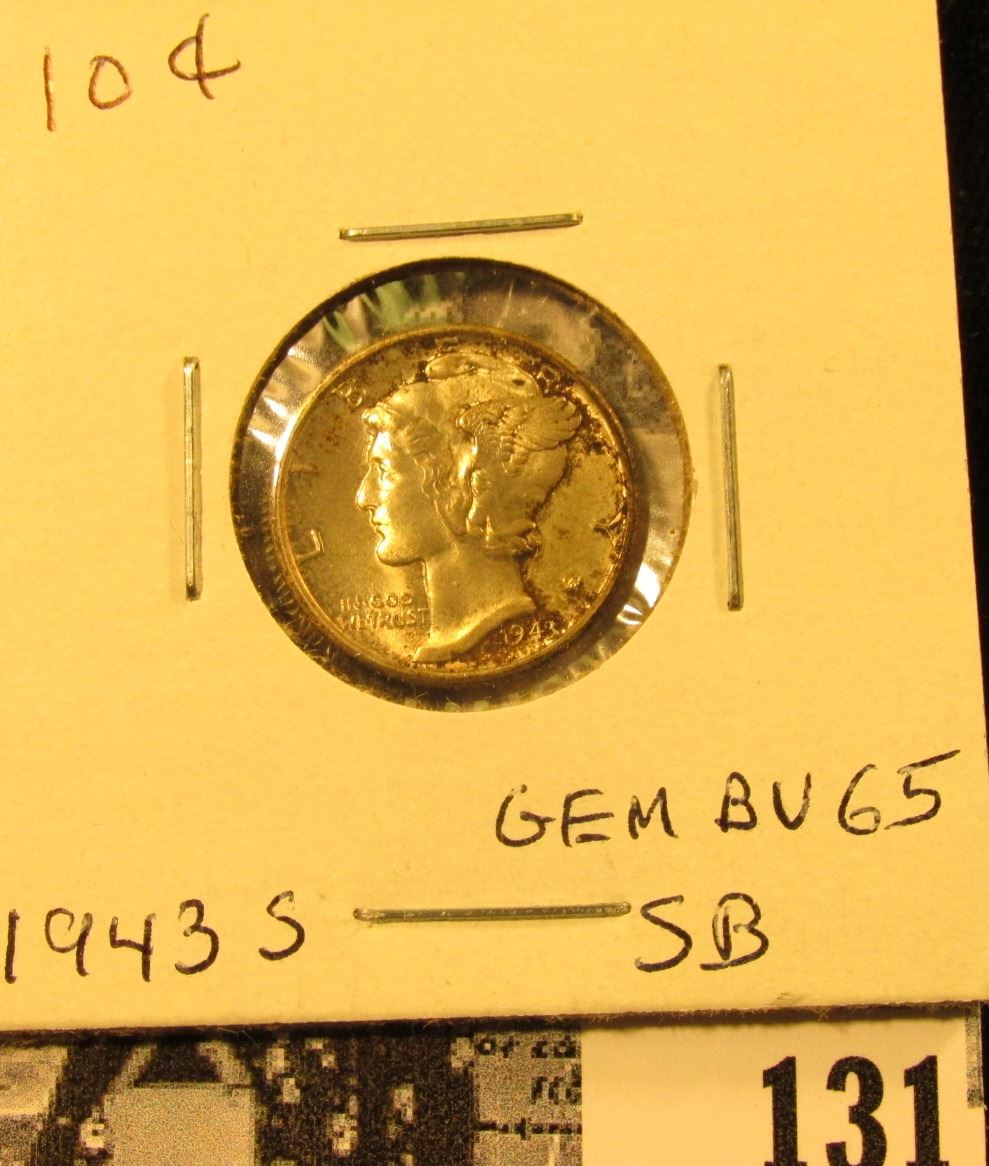 1943 S Mercury Dime GEM BU 65 SB. Superb original toning.