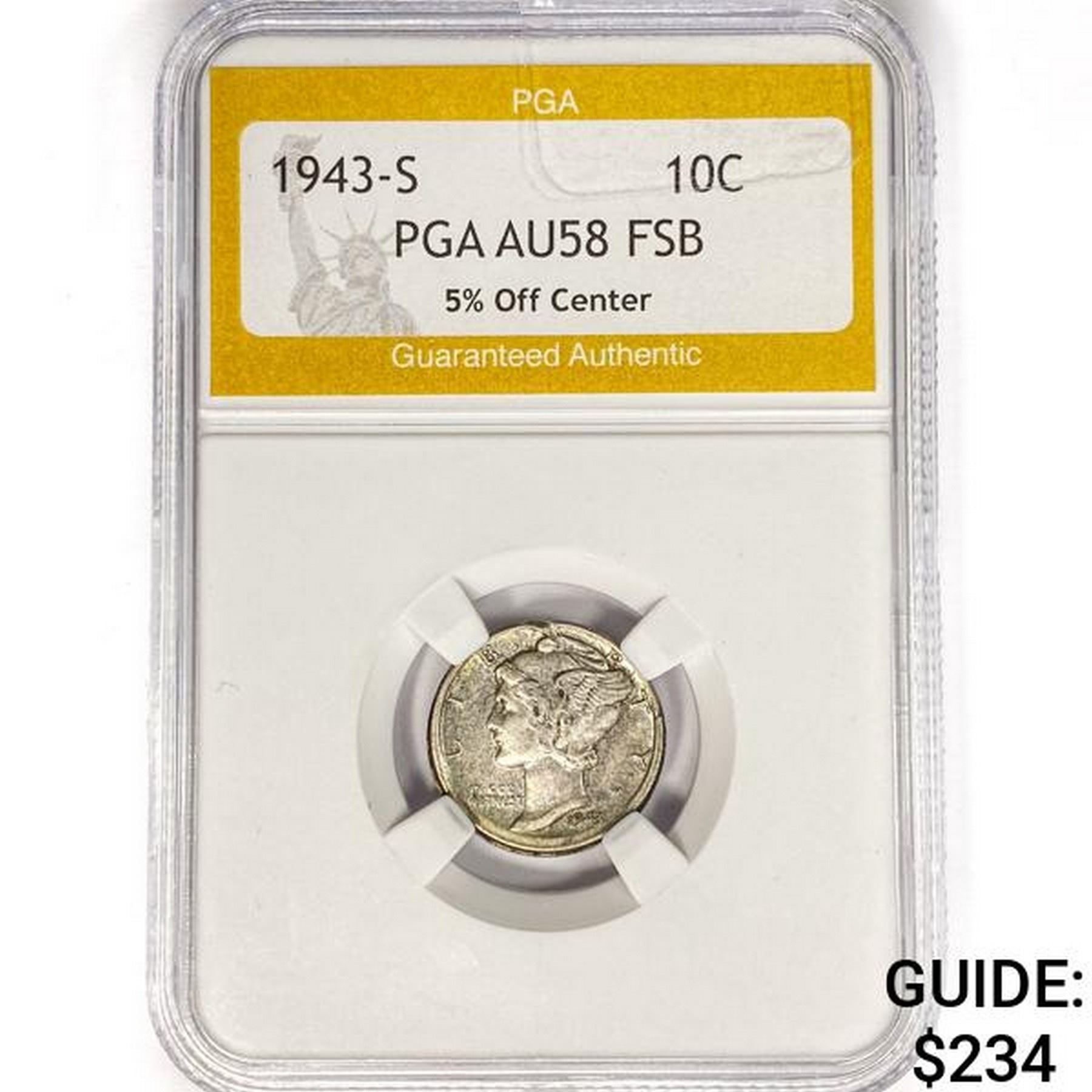1943-S Mercury SILV 10C PGA AU58 FSB 5% Off Center