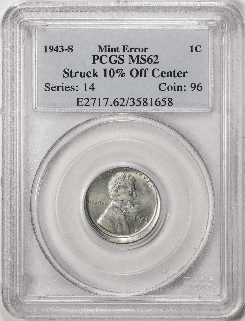 One 1943-S Steel Lincoln Wheat Cent Coin PCGS Mint Error Struck 10% Off Center. PCGS Graded.
