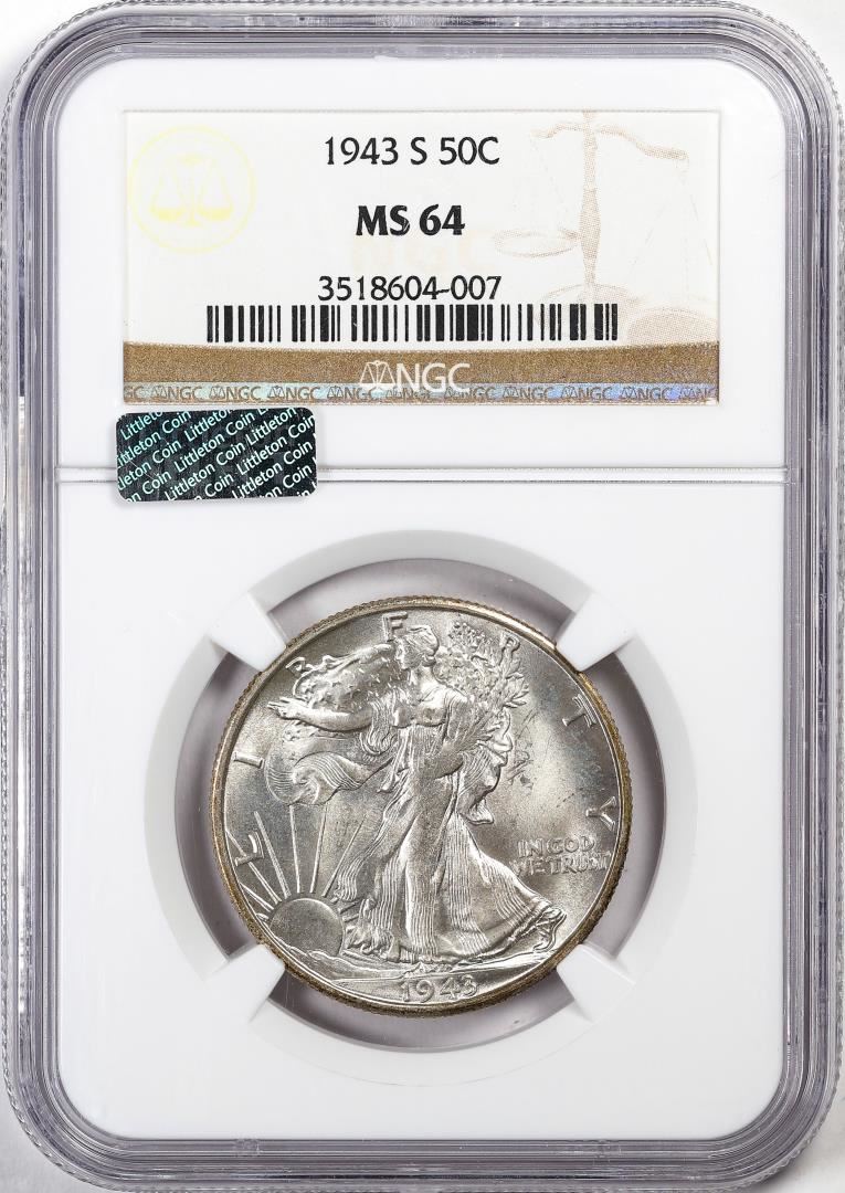 One 1943-S Walking Liberty Half Dollar Coin NGC MS64. NGC Certified.