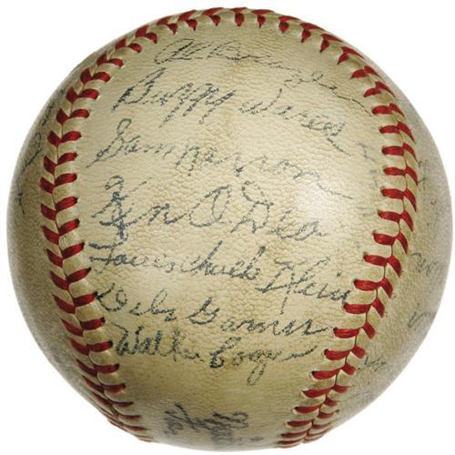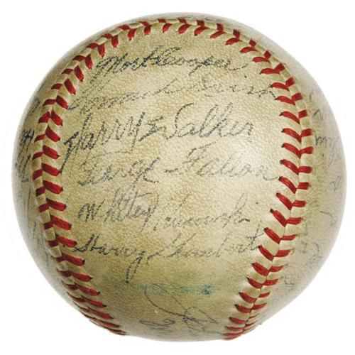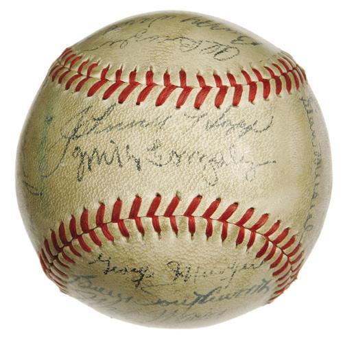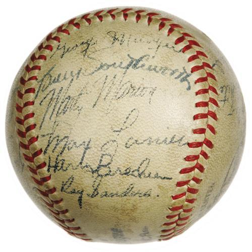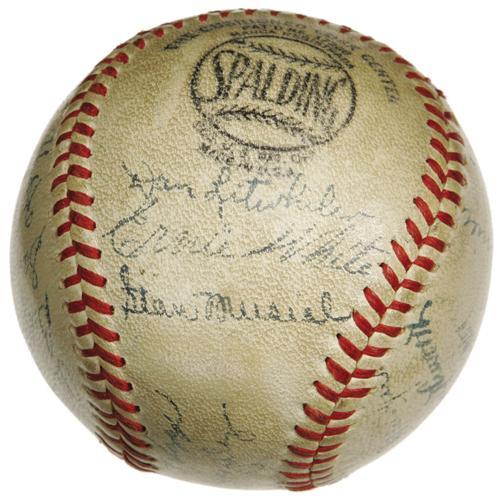 <B>1943 St. Louis Cardinals Team Signed Baseball.</B></I> Another National League Championship for the Redbirds, who finished the regular season a full eighteen games in front of the second place Reds this year. Celebrating that dominant performance is this ONL (Frick) ball autographed by twenty-four members of the squad, most notably a young Stan Musial, Walker, Cooper, Kurowski, Cooper, Lanier and Hopp. Signature quality is a consistent and impressive 7/10 to 9/10. A tough war-era ball. <I>LOA from PSA/DNA. LOA from James Spence Authentication.</B></I><BR><BR><b>Shipping:</b> Balls, etc. (<a target="_blank" href="http://www.heritageauctions.com/common/shipping.php">view shipping information</a>)
