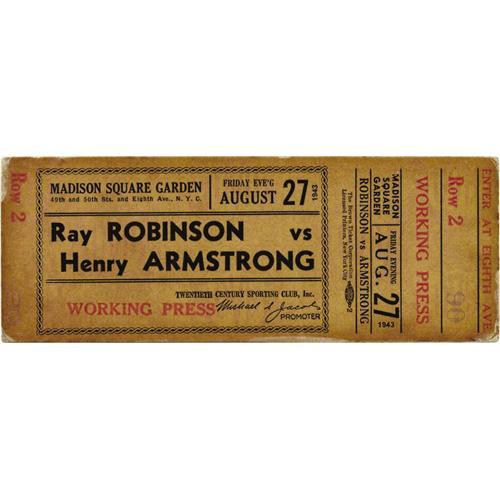 <B>1943 Sugar Ray Robinson vs. Henry Armstrong Full Ticket.</B></I> On August 27, 1943 Sugar Ray Robinson fought Henry Armstrong in New York at Madison Square Garden. Robinson had won forty-three of his first forty-four professional fights and was emerging as a "can't miss" star in the welterweight division. Armstrong, at age thirty, was in the twilight of what had been one of the most decorated careers in the history of boxing. Already a three-weight class champion Armstrong, even at this stage of his career, was considered a dangerous opponent for any foe. This night however would belong to Robinson who won a one-sided ten round decision, easily out-pointing his aging opponent. Presented here is an extremely rare, unused official ticket to this event. This official ticket measures 2.25x6", names both fighters and includes section, row and seat number. The ticket has been laminated and shows minor edge and surface wear but overall is in excellent condition. This is the only example of this extremely rare full ticket that we've seen. <BR><BR><B>Important notice:</B> Heritage usually auctions material at the rate of 200-250 lots per hour. On some occasions eBay Live bid software or the Internet may not be able to keep up with the pace of the auction. We recommend placing a realistic absentee bid now as insurance to avoid disappointment. Occasionally the auctioneer may eliminate or reject an eBay Live bid, and the auctioneer may also reopen a lot after the close of the eBay live bidding (usually because we missed an audience bid), and may reject your bid even if it shows you as the winning bidder. By bidding via eBay Live, you agree that Heritage may award the lot to another bidder at its sole discretion under the circumstances described above or any other reasonable circumstances. Since eBay bids are not shown to us until we open the lot on the floor, we treat those bids just like floor bids. In most cases the floor responds before the eBay bid is presented to us, due to Internet lag time, so for consistency we have made it a policy that floor bids are always considered first over tie eBay live bids. Also please note that all Heritage lots purchased through eBay Live carry a 22.5% Buyer's Premium. Please make sure you read the Terms and Conditions before you bid. This lot is being auctioned in conjunction with a live floor auction by Heritage Galleries & Auctioneers. All final auction and invoice information will be supplied by Heritage Galleries & Auctioneers, and all other information should be considered preliminary. Lot:19156 <BR><BR><B>Winning Notification and Billing:</B> After the FINAL session in this auction is complete, Heritage will send e-mail and snail mail invoices. This process normally takes several days. All final auction and invoice information will be supplied by Heritage Galleries & Auctioneers, and all other information should be considered preliminary. <BR><BR>This auction will be conducted on a live auction floor and over the Internet through eBay Live. If you choose to place an absentee bid, please take a moment to <font color='#0000ff'><u><a href='http://pages.ebay.com/liveauctions/help/before/laabsentee.html'>learn how eBay Live absentee bidding works</a></u></font><font color='#000000'>