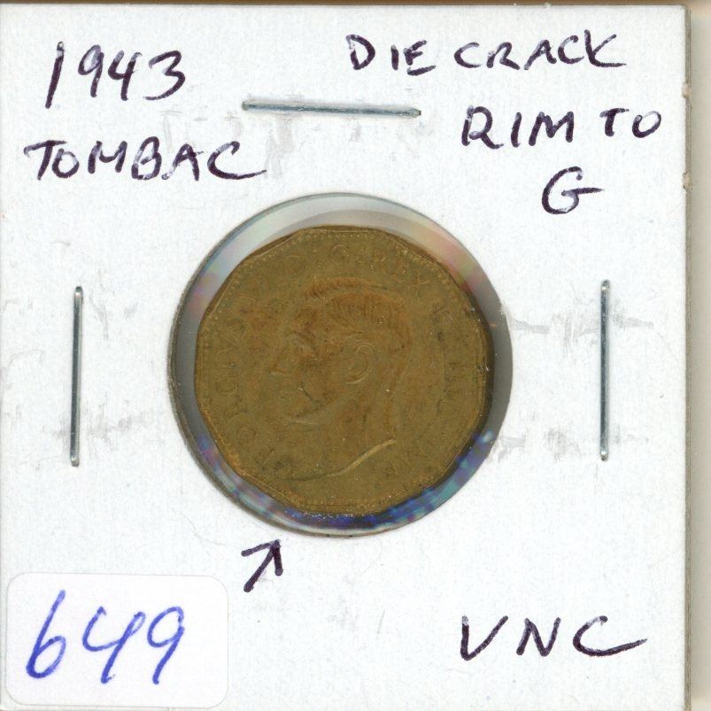 1943 Tombac 5 Cents. Coin displays a Die Crack from the Rim to first G in GEORGE. The first Morse Code coin in the world. Uncirculated.