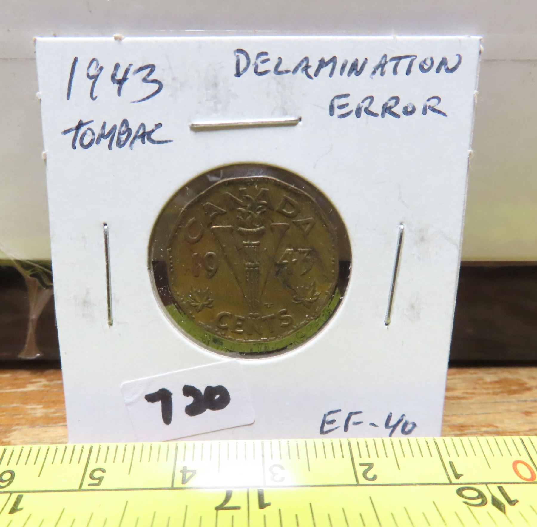 1943 Tombac Delamination Error. Part of the coin has broken off near the 43 in the date. EF-40.
