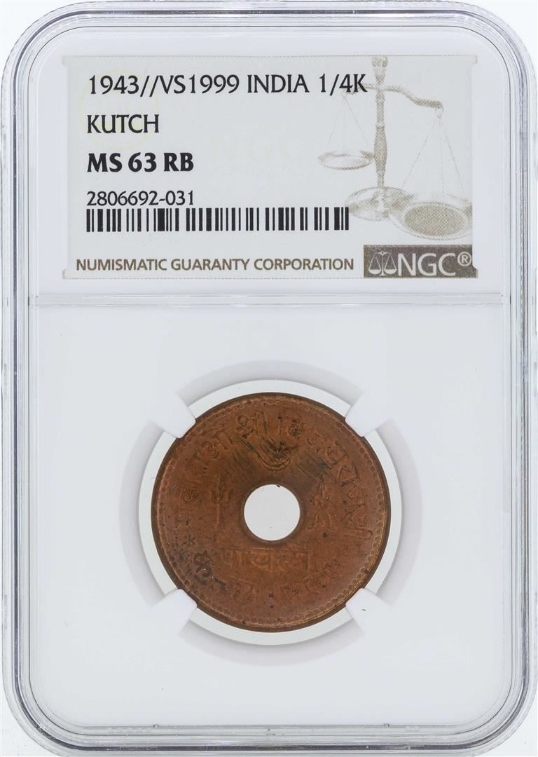 One 1943/VS1999 India 1/4 Kutch Coin NGC MS63RB. NGC Certified.