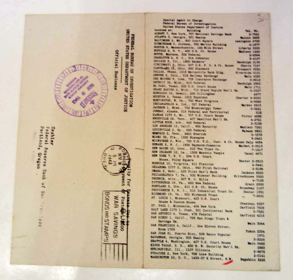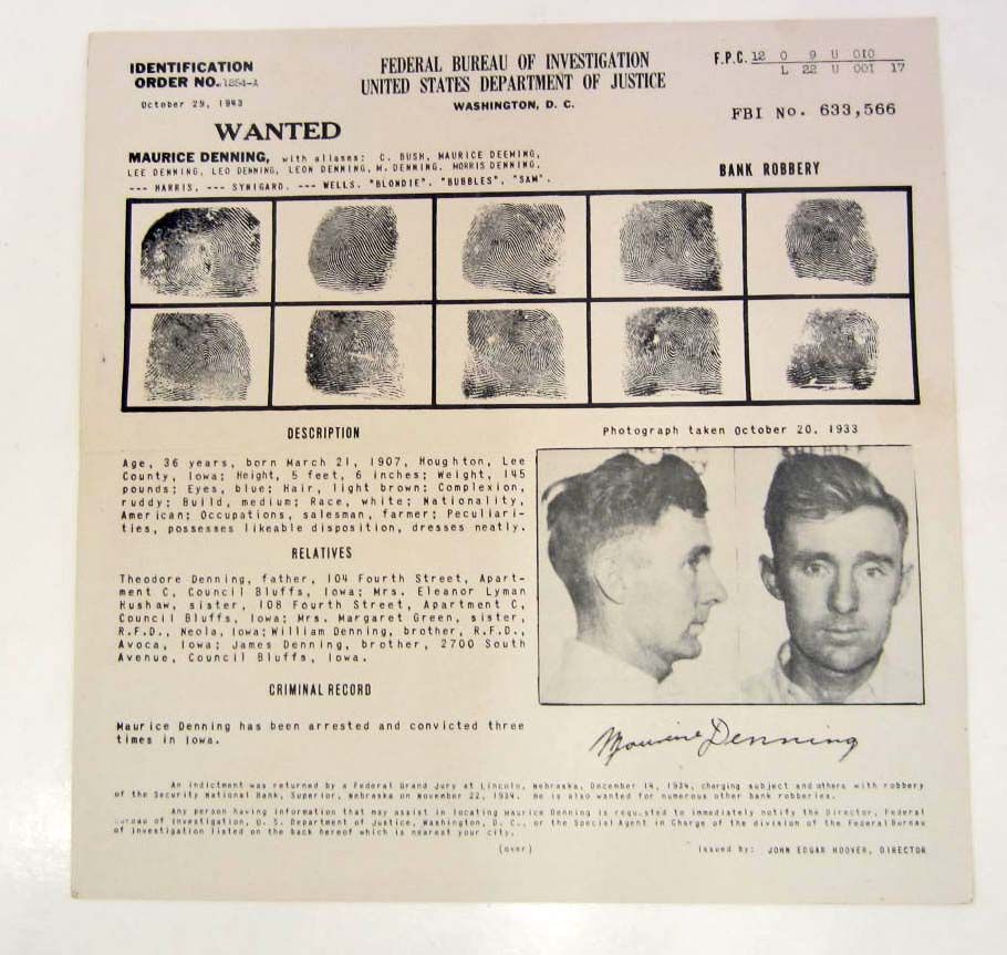 With Mug Shot Photos & Fingerprints. Maurice Denning was Wanted for Bank Robbery. This Poster was Mailed to the Federal Reserve Bank of San Francisco in Portland Oregon. Size unfolded is 8" x 8"