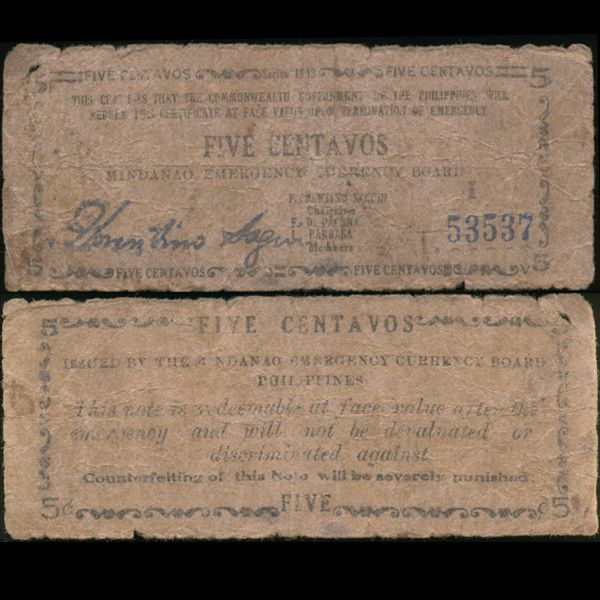 1943 WW2 Guerrilla Rebel Philippines 5c Note Mindanao (CUR-07159)
