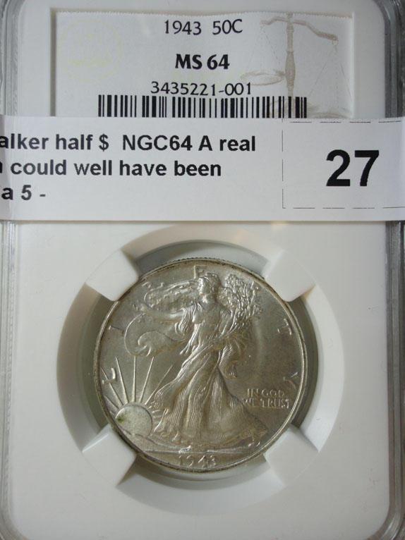 1943 Walker half $ NGC64 A real PQ coin could well have been graded a 5