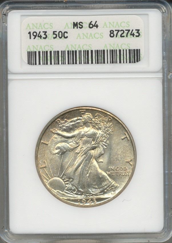 One 1943 Walking Liberty Half Dollar Coin ANACS MS64.