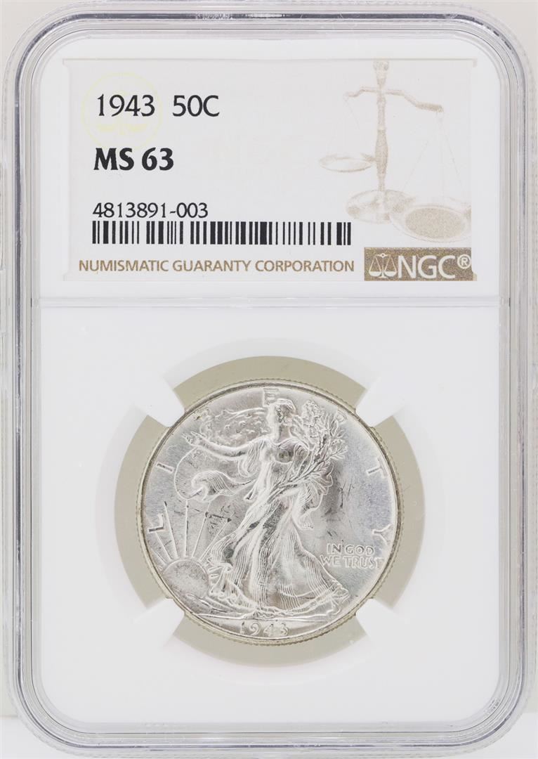 One 1943 Walking Liberty Half Dollar Coin NGC MS63. NGC Certified.