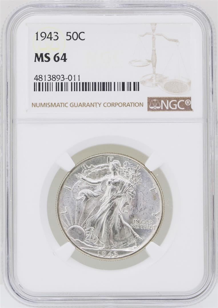 One 1943 Walking Liberty Half Dollar Coin NGC MS64. NGC Certified.
