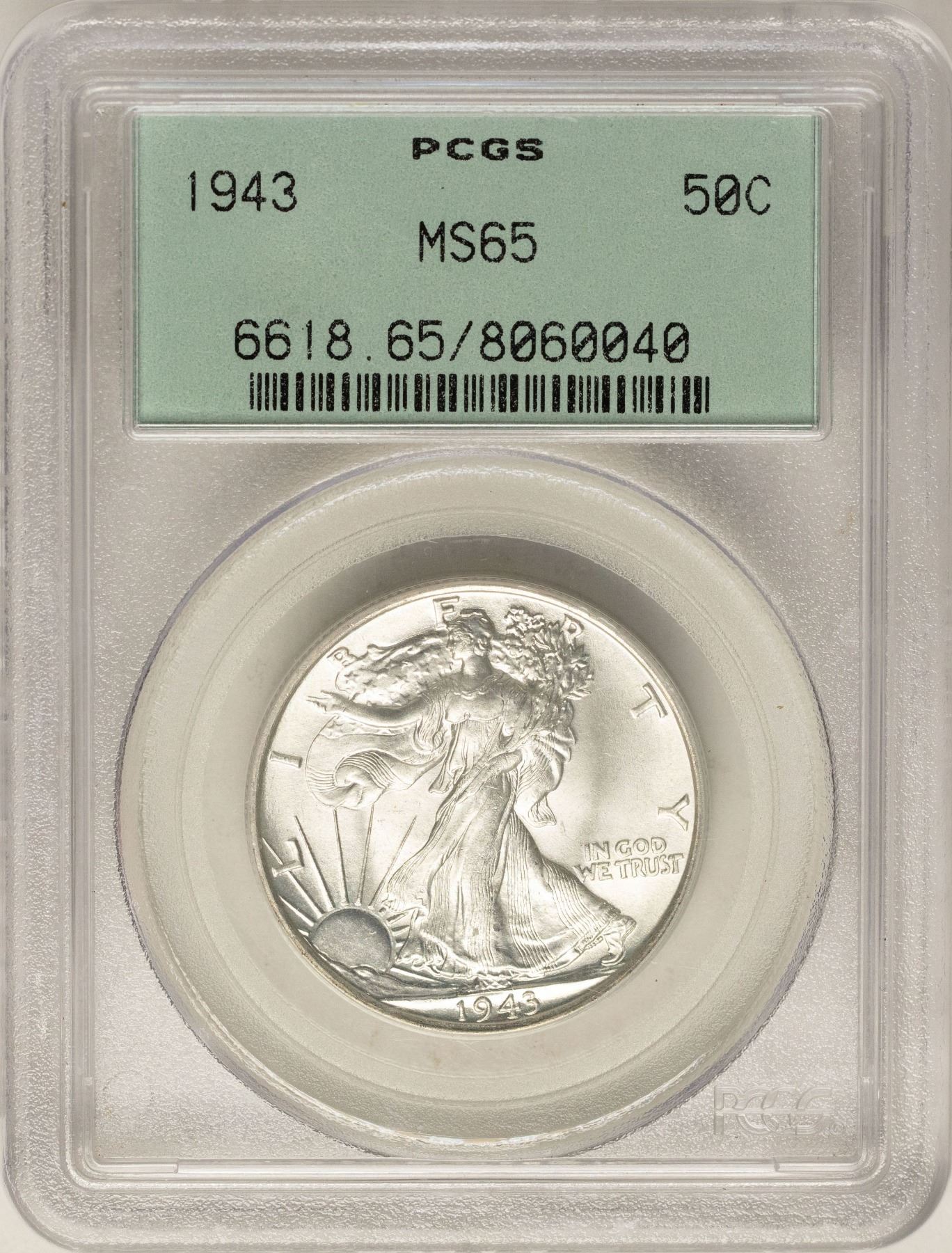 1943 Walking Liberty Half Dollar Coin PCGS MS65 Old Green Holder