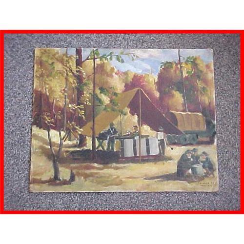 <tr><td>Title:1943 World War II US Soldiers Camp Oil Painting</td></tr>