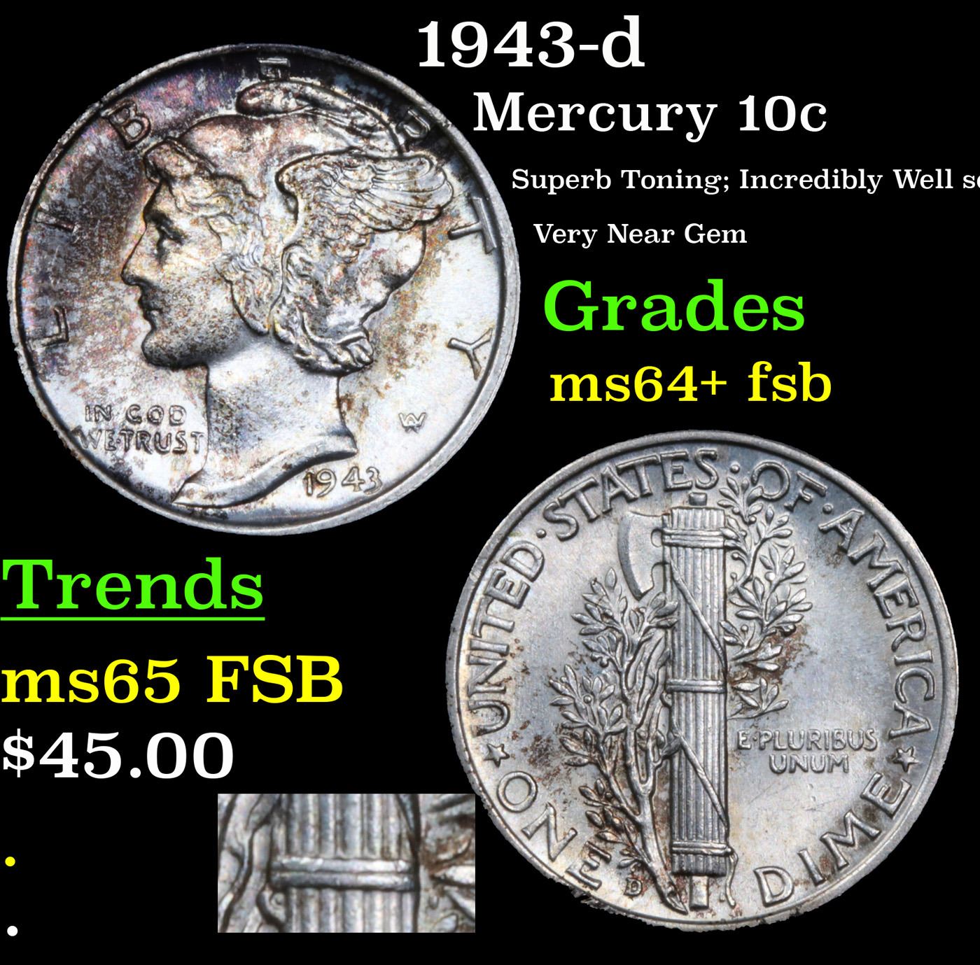 1943-d Mercury Dime 10c Grades Choice Unc+ FSB.