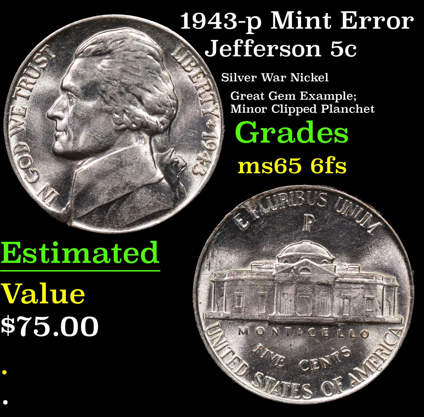 1943-p Mint Error Jefferson Nickel 5c Grades GEM 6fs.